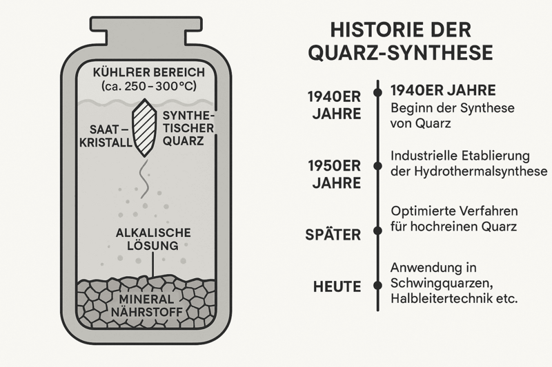 - In de jaren 1940 begon de synthese van kwarts in zogenaamde hydrothermale fabrieken - een proces dat natuurlijke groeiomstandigheden nabootst.