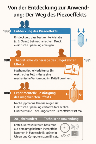 - Beschrijving: Lippmann theoretiseerde dat vanwege de omkeerbaarheid van fysische processen, het omgekeerde effect ook moet bestaan: Een elektrische spanning moet een mechanische vervorming in het kristal veroorzaken.